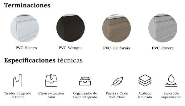 Rivo es un mueble para baño disponible en versiones de pie (tres cajones) y colgante (dos cajones). Está sellado y recubierto con una capa de PVC, lo que asegura funcionalidad y diseño.