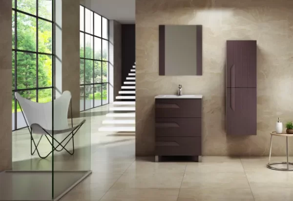 El vanitory Rivo de 60 cm aporta un toque rústico y sofisticado al baño. Su tono wengue oscuro resalta la veta de la madera y crea una atmósfera cálida y elegante.